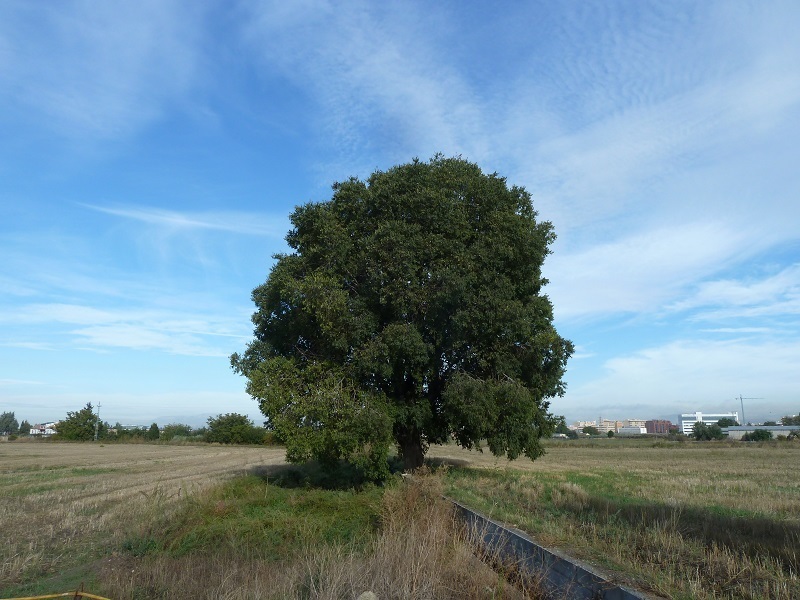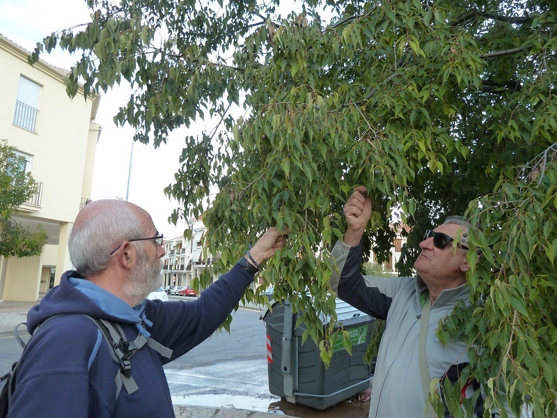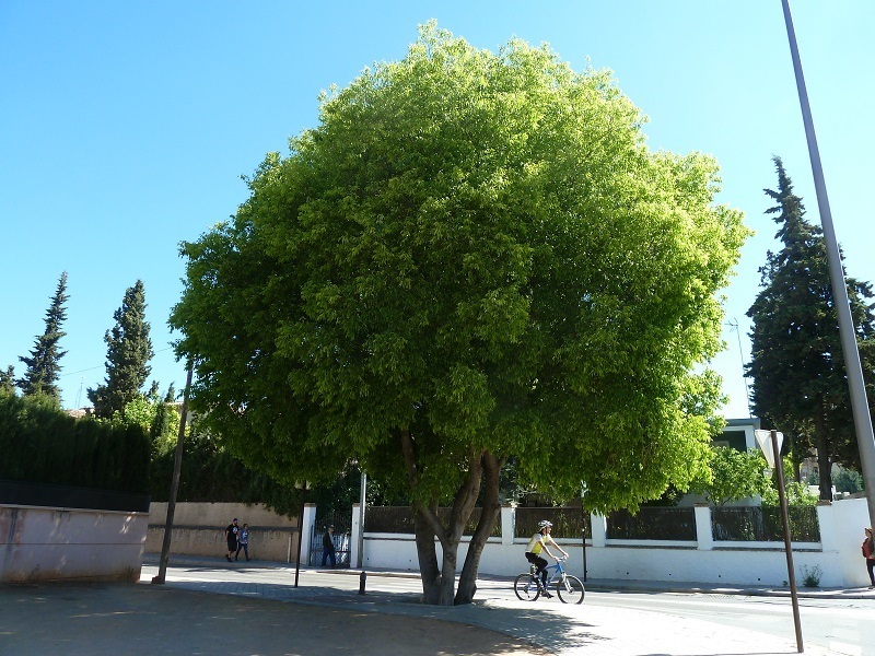 Bueno, los que no me conozcáis os preguntaréis dónde me encuentro. Dos grandes ejemplares vivimos en Gabia la Chica cerca de la fuente que da el agua tan buena, milagrosa dicen algunos, en la Cañada, al lado del antiguo molino de aceite. Mi compañero tiene más de 100 años, ahora está malito y hace unos meses se le partió el tronco. El otro soy yo y me encuentro muy sano. Dice un abuelete de por aquí que cuando era niño yo era como una vareta. Total, que puedo tener unos 70 años, como él. Este abuelo me mira y todavía recuerda emocionado cuando ya adolescente cogía mis frutos. En las tardes de otoño se suele sentar debajo de mis ramas. ¡Ay! ¡Crecimos juntos! En fin, por aquí hay también un árbol del paraíso y una higuera.
