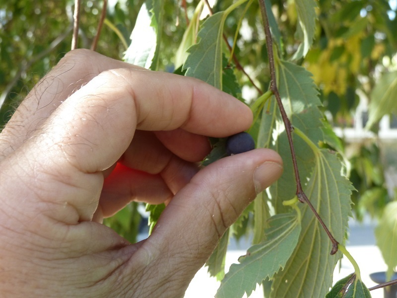 Bueno, pues ahora en octubre es cuando están mis frutos negros y por tanto comestibles. ¡Ea! coged las que queráis. Os invito a que probéis mi sabor dulzón. ¡Pero no me partas las ramas! Y bueno, ya que me conocéis, de vez en cuando os paráis junto a mí y me miráis, que también nos gusta que nos echen cuentas. Observarme; ahora en otoño tengo hojas y frutos negros, después mis hojas van amarilleando hasta que en invierno quedo desnudo. En primavera me salende nuevo hojitas, después flores y ya para junio tengo las bolitas, todavía verdes, por septiembre se ponen amarillas, a primeros de octubre ya están pintonas o negras”¦ En fin, ya sabéis, me llamo almez; encantado de conoceros. ¡Y no me ignoréis! ¡Ay! ¡Estos humanos tan distraídos con sus móviles qué poco nos aprecian!
