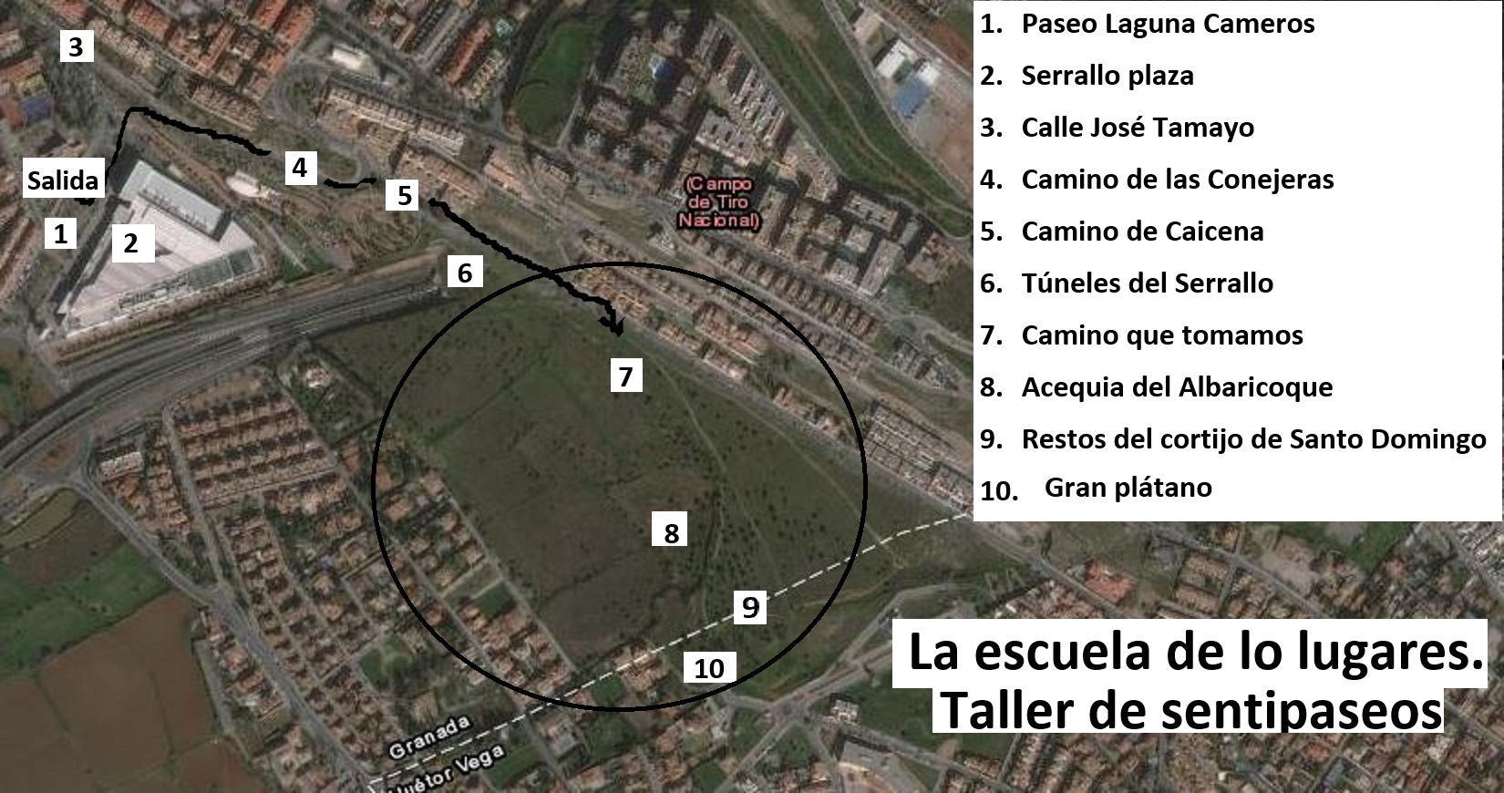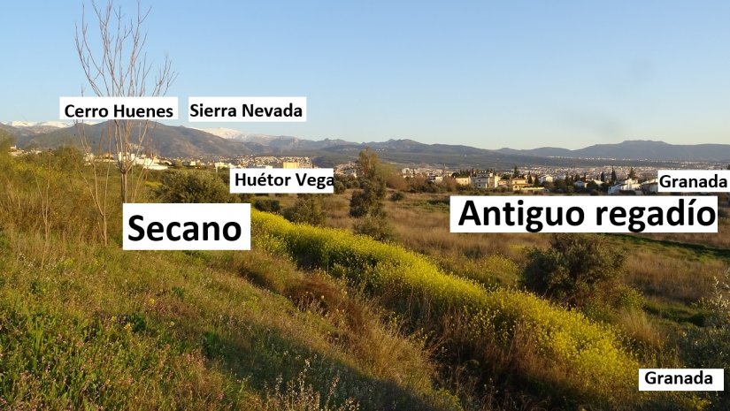 2. ¿Cómo era este lugar?, Hace varias décadas, la mitad, campo regado por la acequia del Albaricoque. Ésta, desde Monachil, donde tiene la toma, entraba en Granada por este lugar hasta el palacio de Quinta Alegre en la avenida de Cervantes, donde moría. La otra mitad, más alta, sería secano; los restos del olivar abandonado parecen confirmarlo. (Imagen 3)